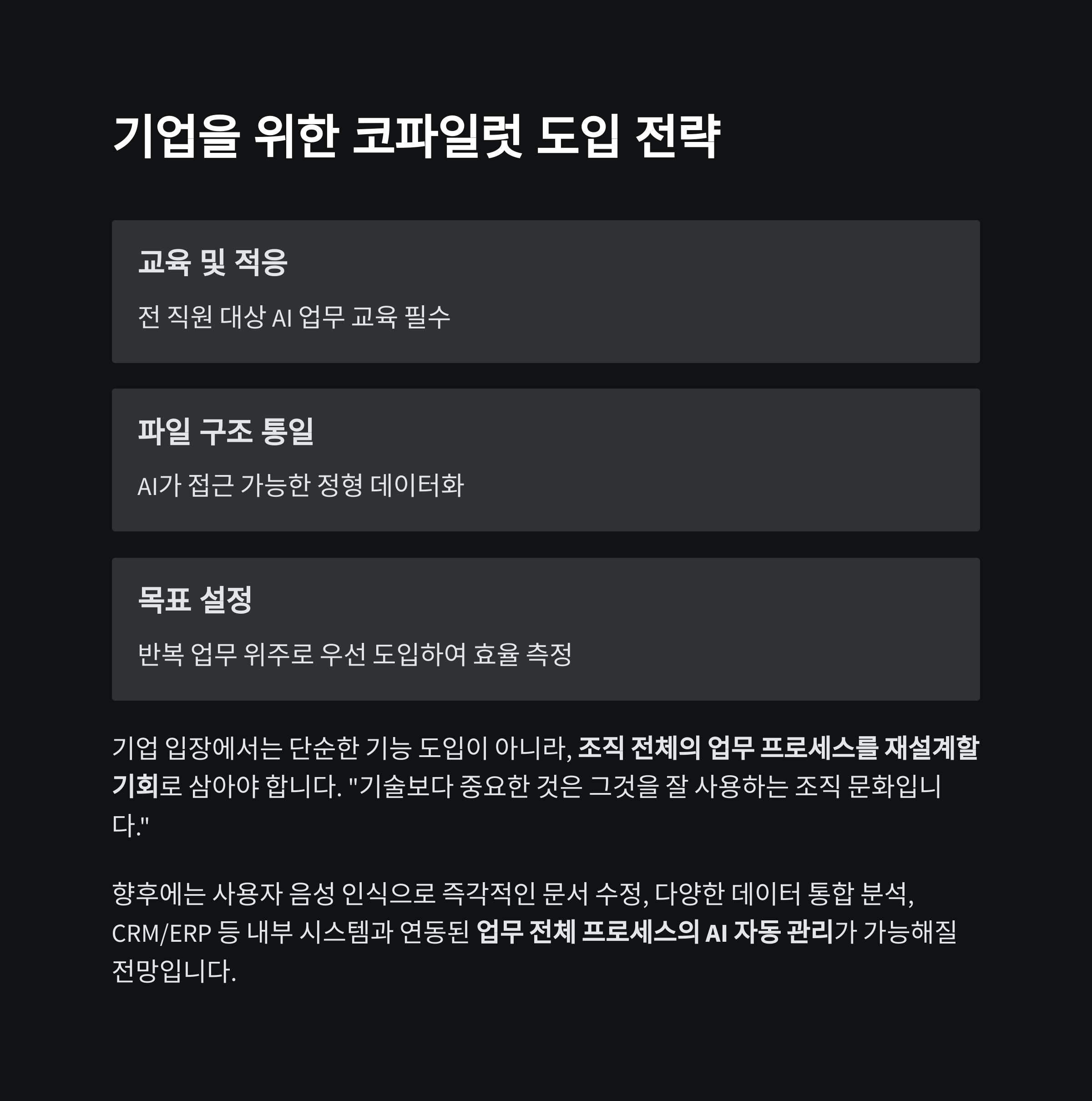 | 교육 및 적응 | 전 직원 대상 AI 업무 교육 필수 |