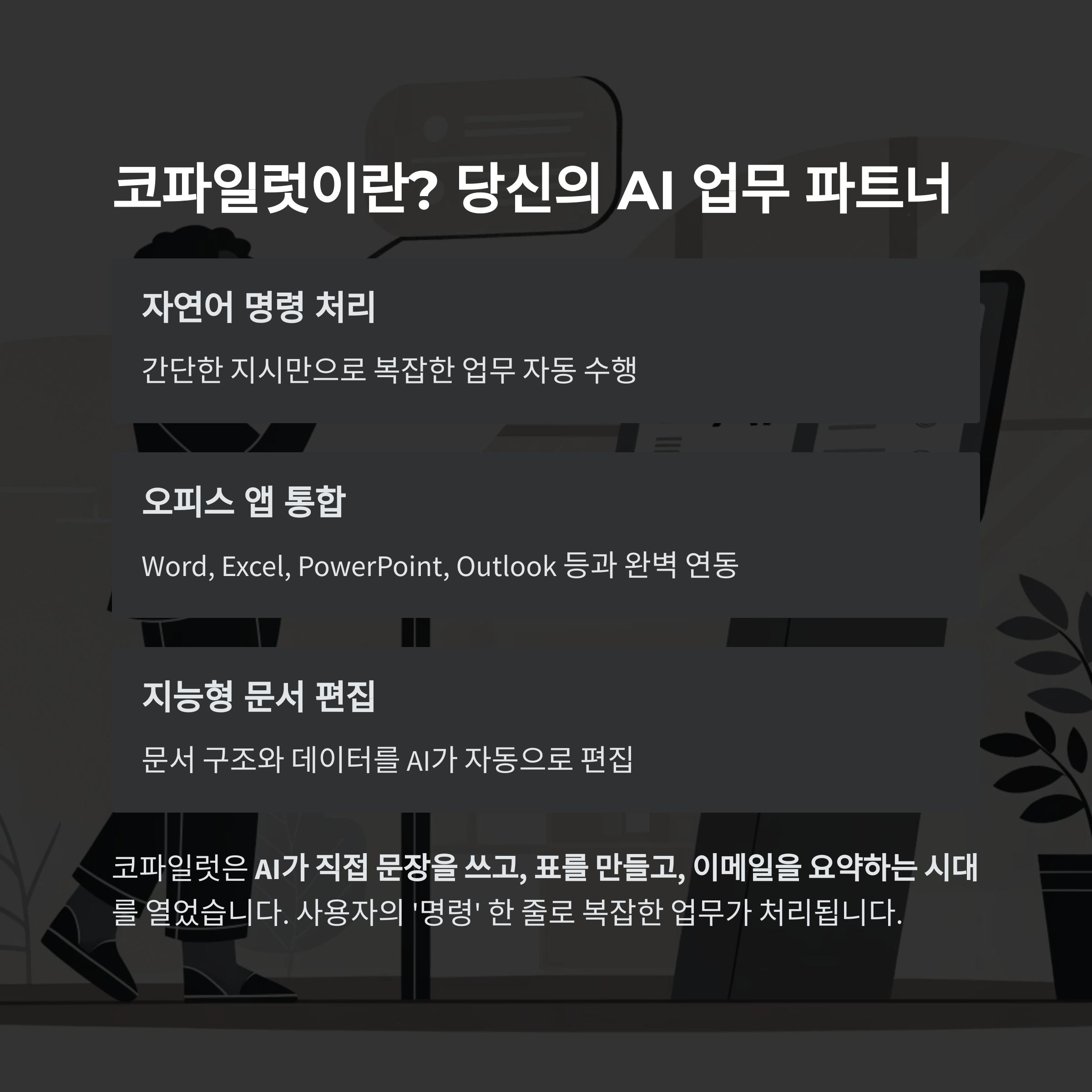 코파일럿은 지금도 수많은 기업과 개인의 오피스 업무를 바꾸고 있습니다.