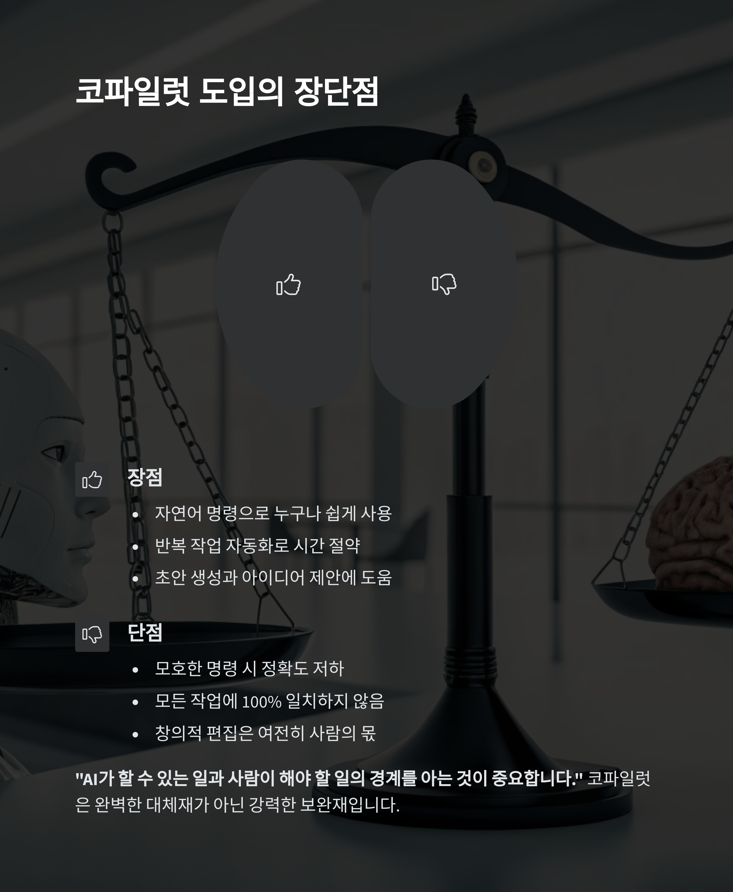 | 창의성 | 초안 생성, 아이디어 제안에 도움 | 창의적 편집은 여전히 사람 몫 |