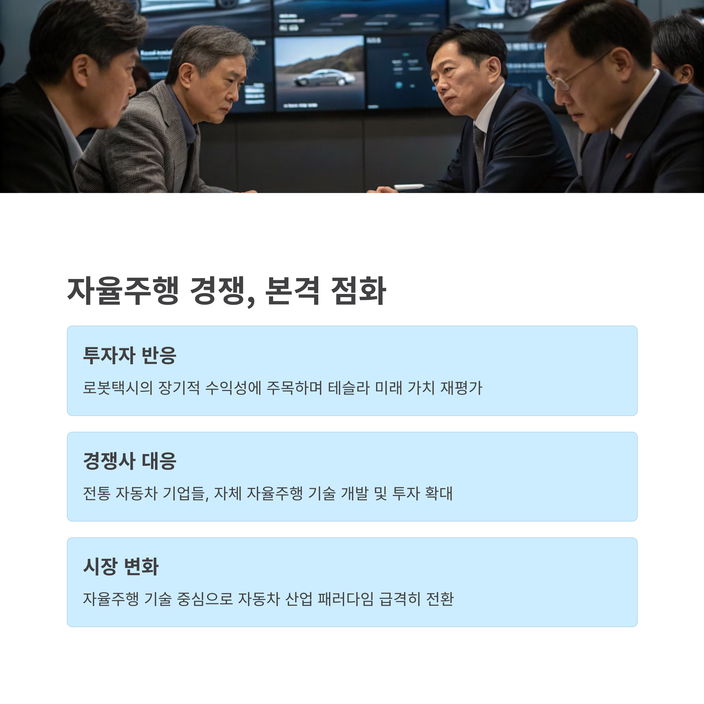 로봇택시 소식은 다른 자동차 제조사들과 자율주행 기술 스타트업에도 강한 자극을 주었습니다. 특히 GM의 크루즈, 구글의 웨이모, 애플의 프로젝트 타이탄 등은 즉각적인 전략 수정에 나섰다는 소문도 있습니다. 경쟁이 본격화되면 기술 발전 속도는 더욱 가속화될 것입니다.