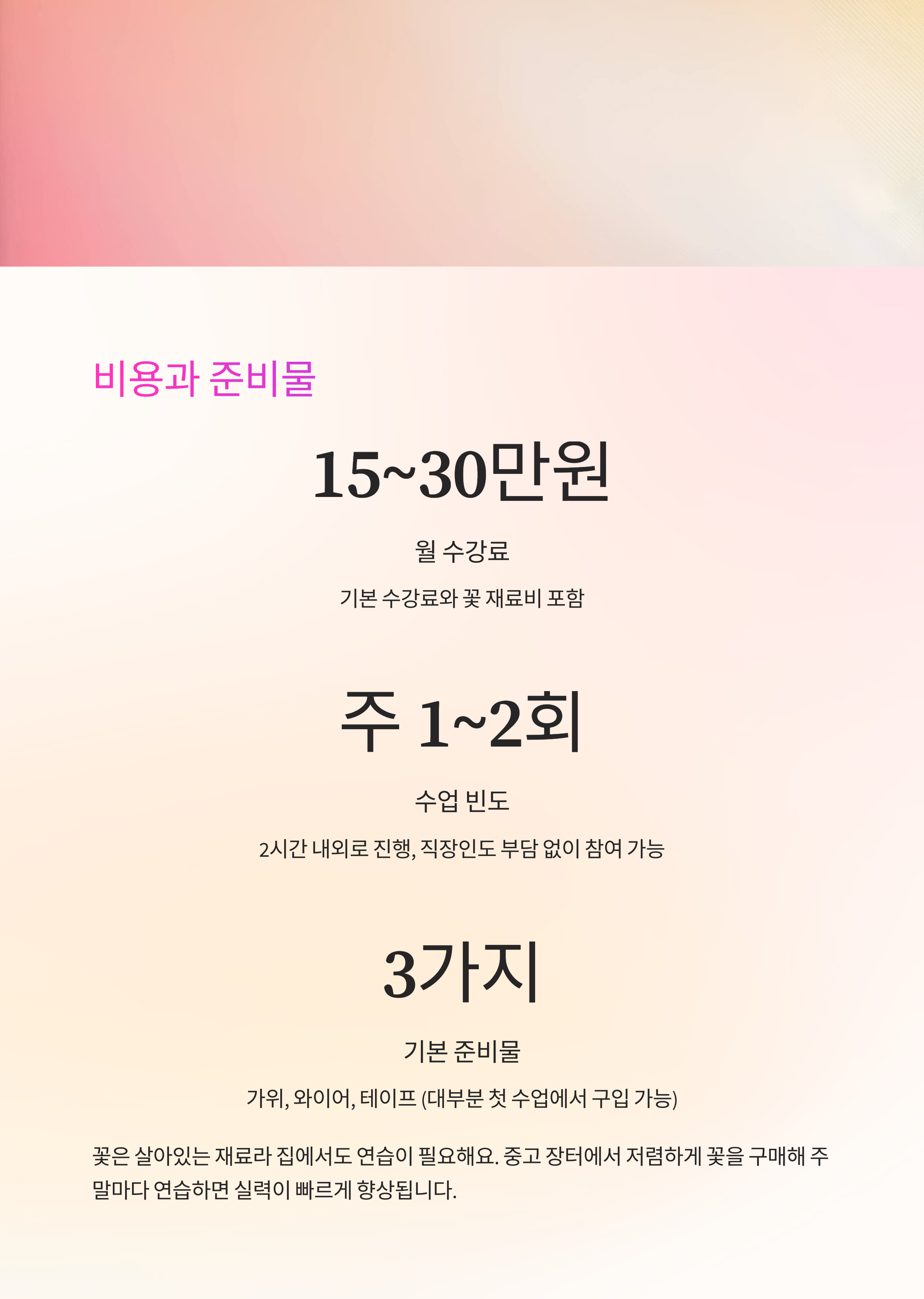 솔직히 말하면 꽃값이 조금 부담되긴 했어요. 클래스마다 다르지만, 대부분 기본 수강료 외에 꽃 재료비가 따로 들어가더라고요. 보통 한 달 기준 15만원에서 30만원 정도는 각오해야 해요. 대신 내가 고른 꽃으로 직접 작품을 만들 수 있다는 점에서 그 가치는 충분하다고 생각했어요. 준비물은 가위, 와이어, 테이프 등인데, 대부분 첫 수업에서 대여나 구입이 가능했어요.