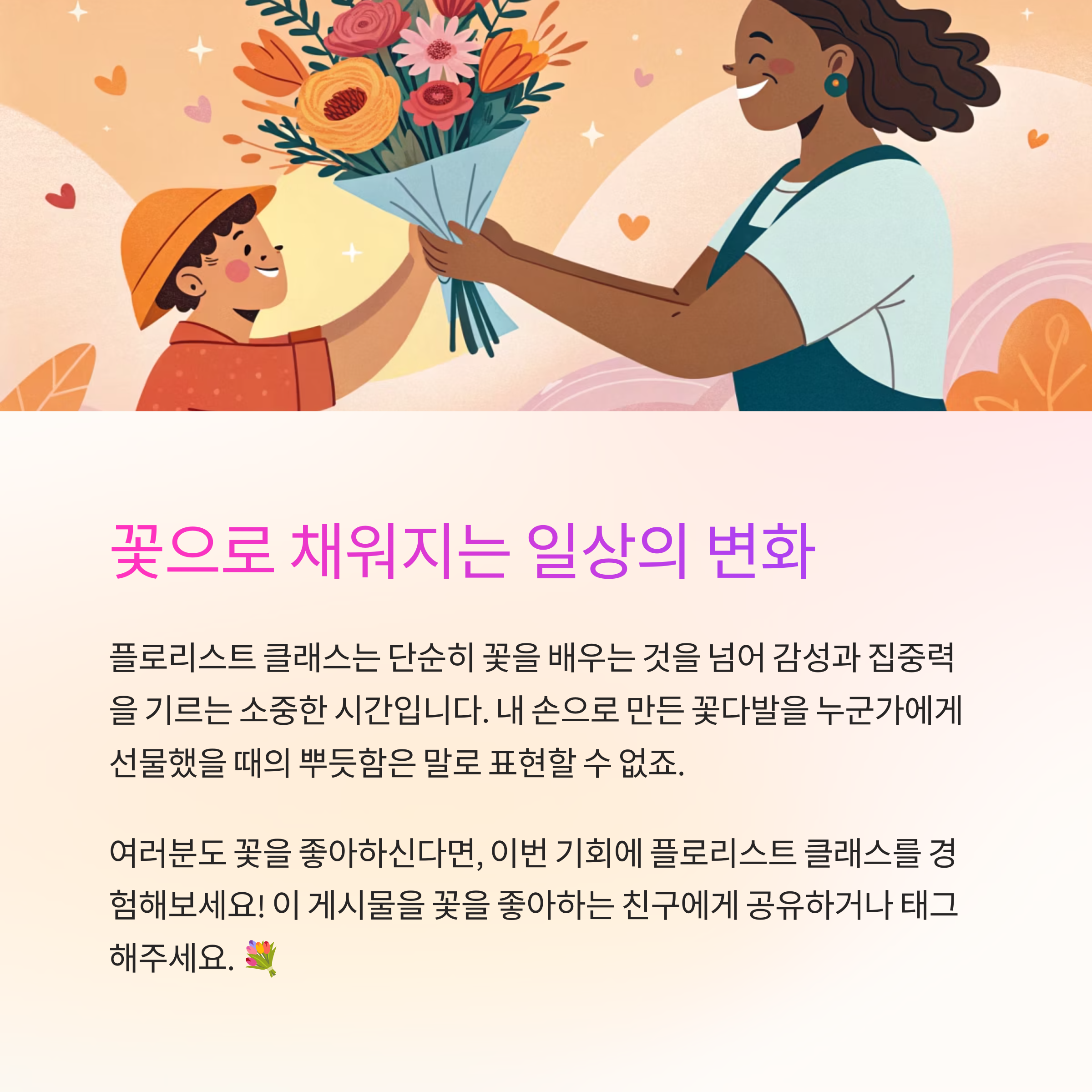 혹시 여러분도 평소 꽃을 좋아하셨다면, 이번 기회에 플로리스트 클래스 한 번 경험해보시는 건 어떨까요? 생각보다 더 재미있고, 내 삶에 작은 변화를 줄 수도 있어요.
