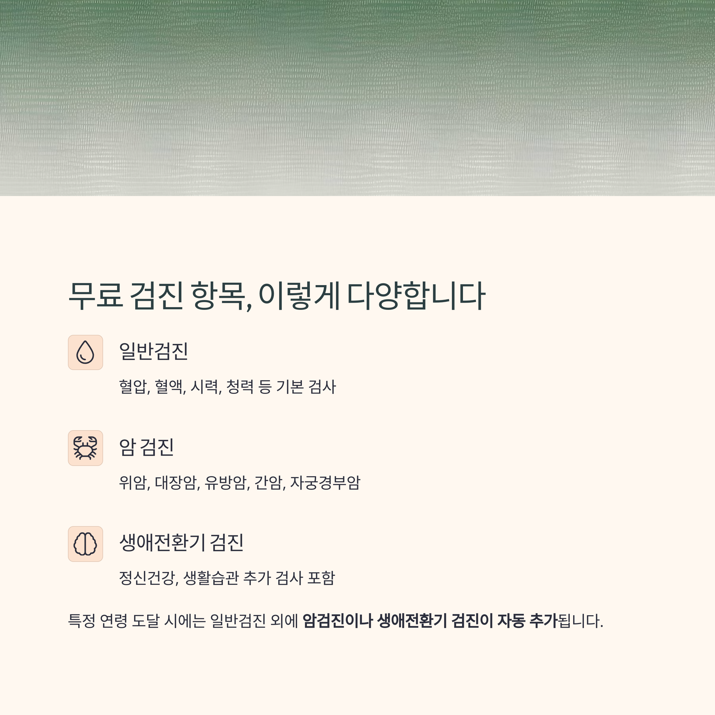 핵심: 특정 연령 도달 시에는 일반검진 외에 암검진이나 생애전환기 검진이 자동 추가됩니다.