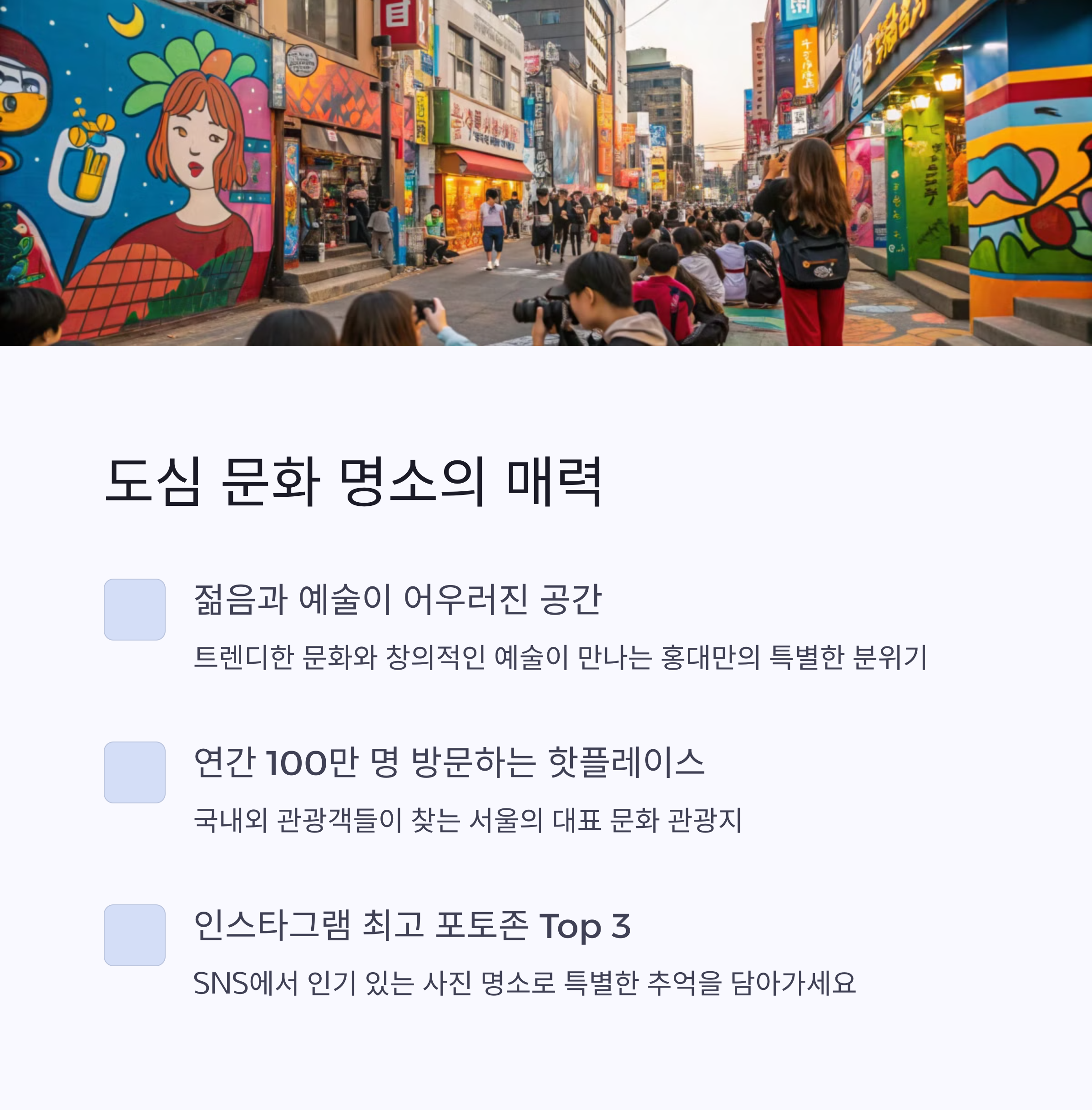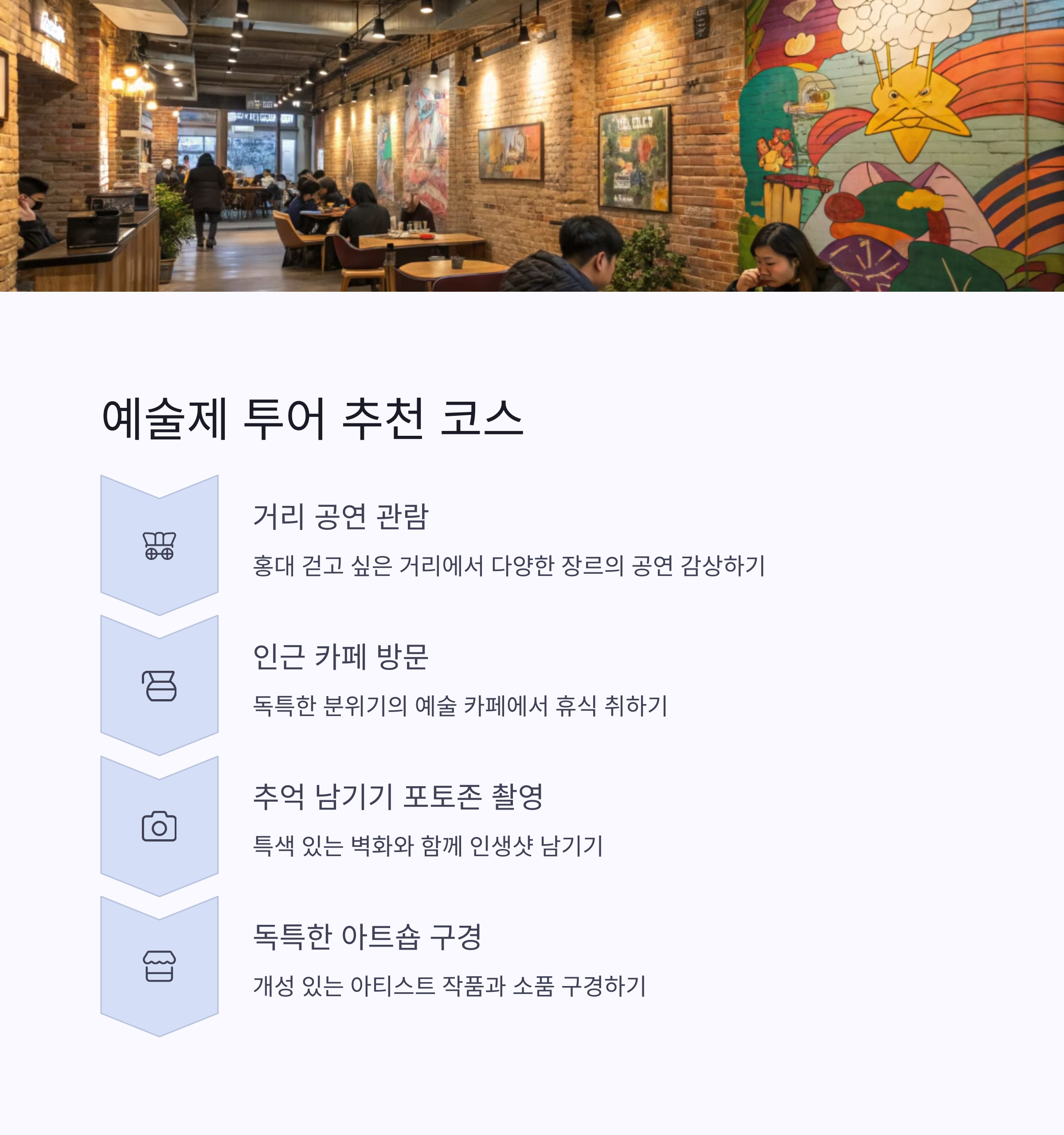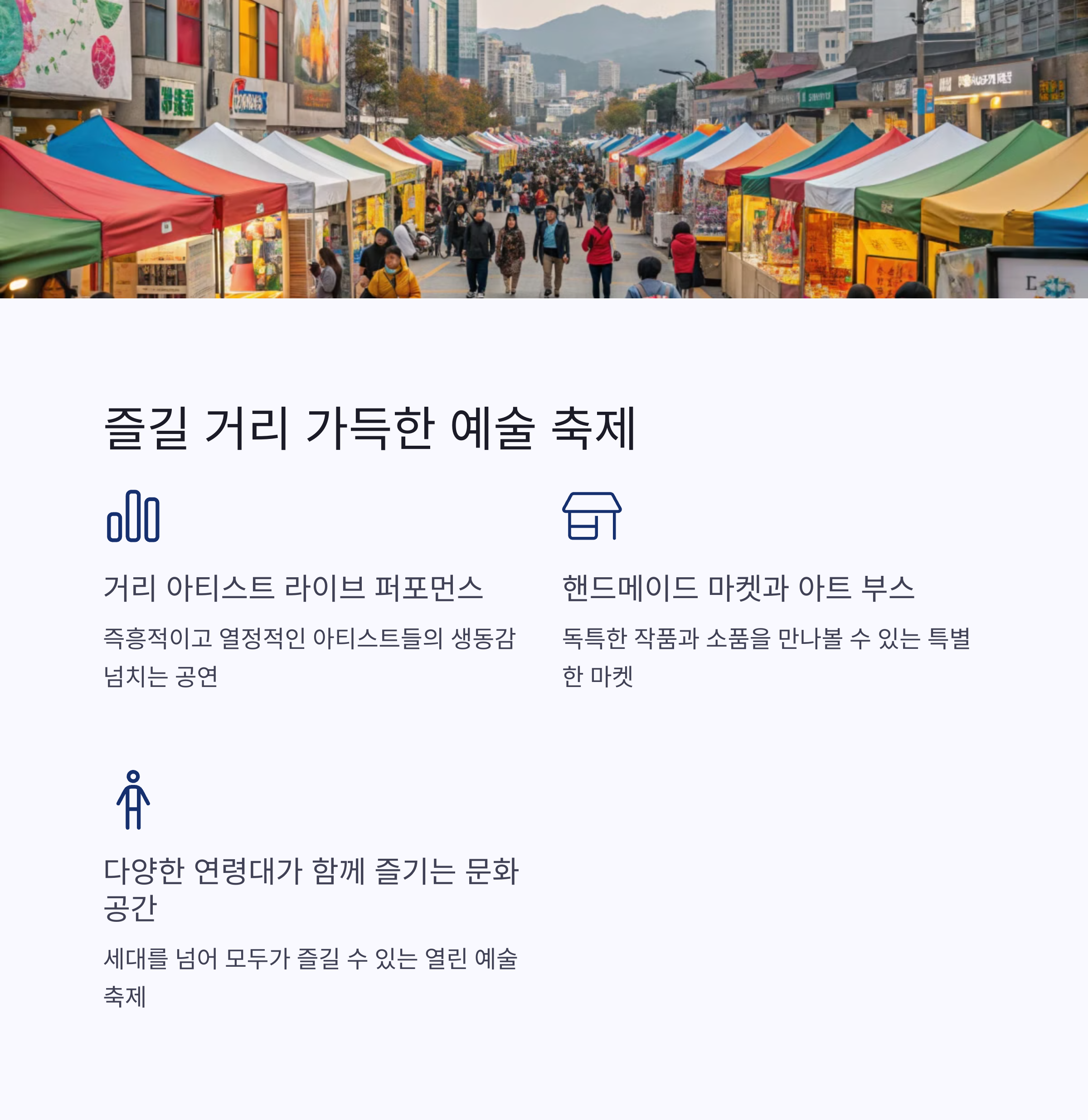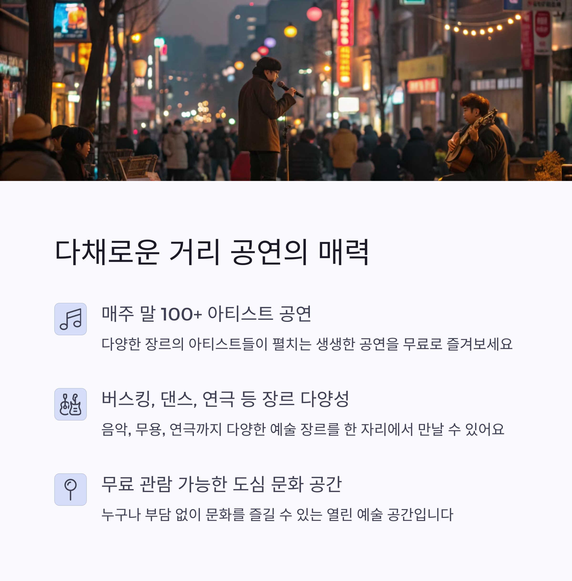 | 거리 공연 외에 참여형 부스도 운영돼요 | 인근 갤러리와 벽화 골목도 함께 즐겨보세요 | 날씨나 교통상황도 미리 체크하는 것이 좋아요 |
