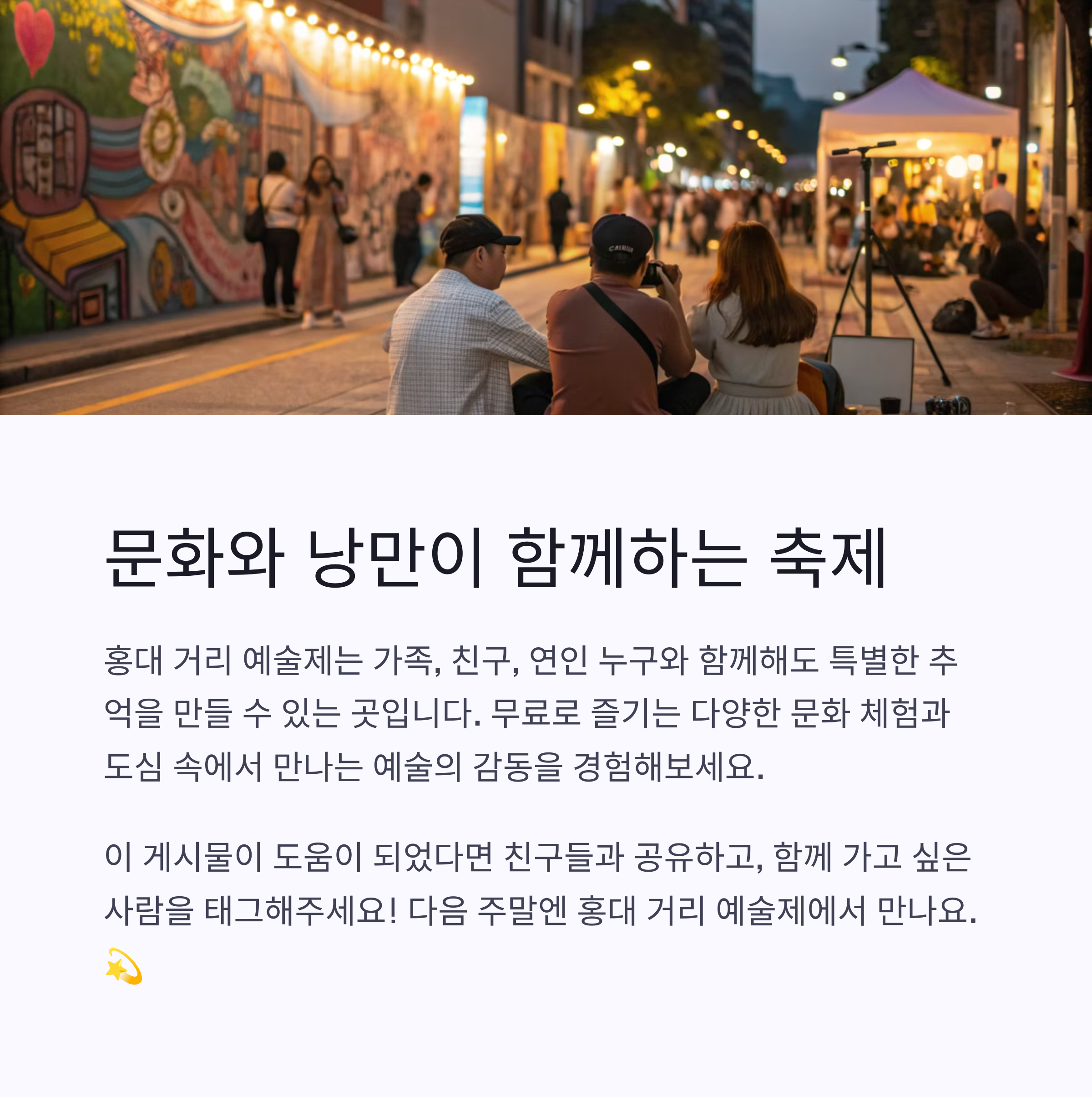 여러분은 어떤 예술제 경험을 갖고 계신가요? 혹은 홍대 거리 예술제를 방문한 적이 있으신가요? 소중한 이야기와 팁을 댓글로 나눠주시면 다른 분들에게도 큰 도움이 됩니다.