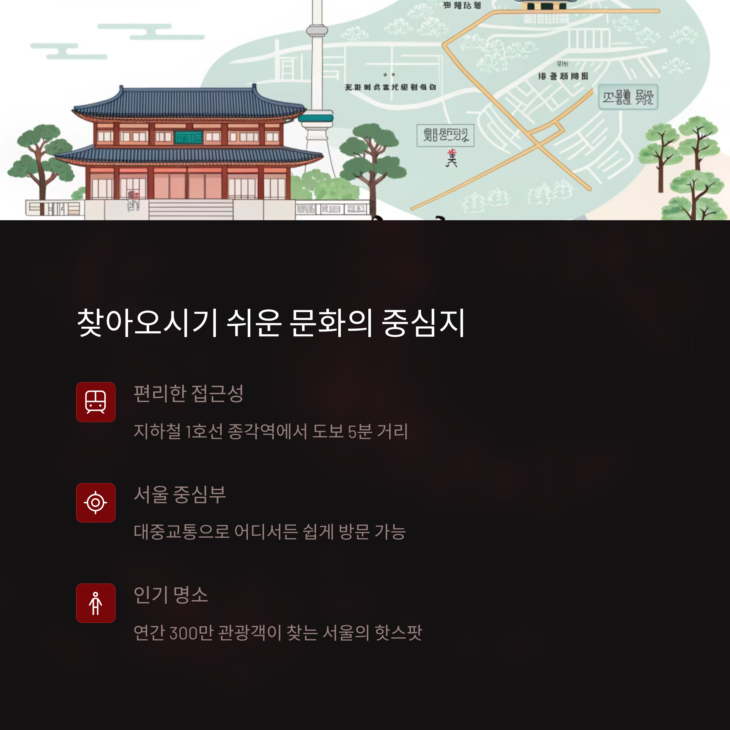 가족 나들이 및 외국인 관광객에게 인기 | 1호선 이용 시 환승 없이 편리하게 이동 | 민속놀이, 한복 체험 등 현장 참여 가능 |