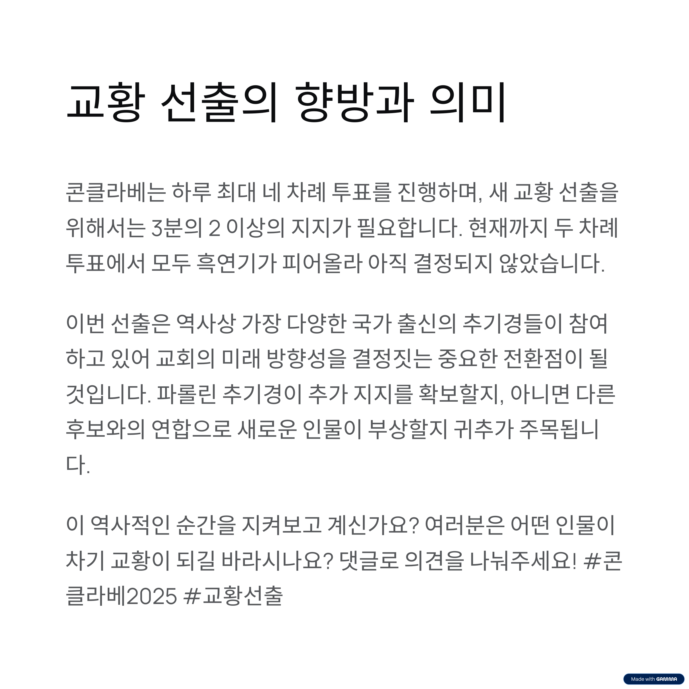 2025년 5월, 교황 프란치스코의 선종 이후 바티칸 시스티나 성당에서 133명의 추기경들이 차기 교황을 선출하기 위한 콘클라베를 진행 중입니다. 현재까지 두 차례의 투표에서 모두 흑연기가 피어오르며 아직 교황이 선출되지 않았습니다. 이번 콘클라베는 역사상 가장 다양한 국가 출신의 추기경들이 참여하고 있어, 차기 교황의 향방에 전 세계의 이목이 집중되고 있습니다.