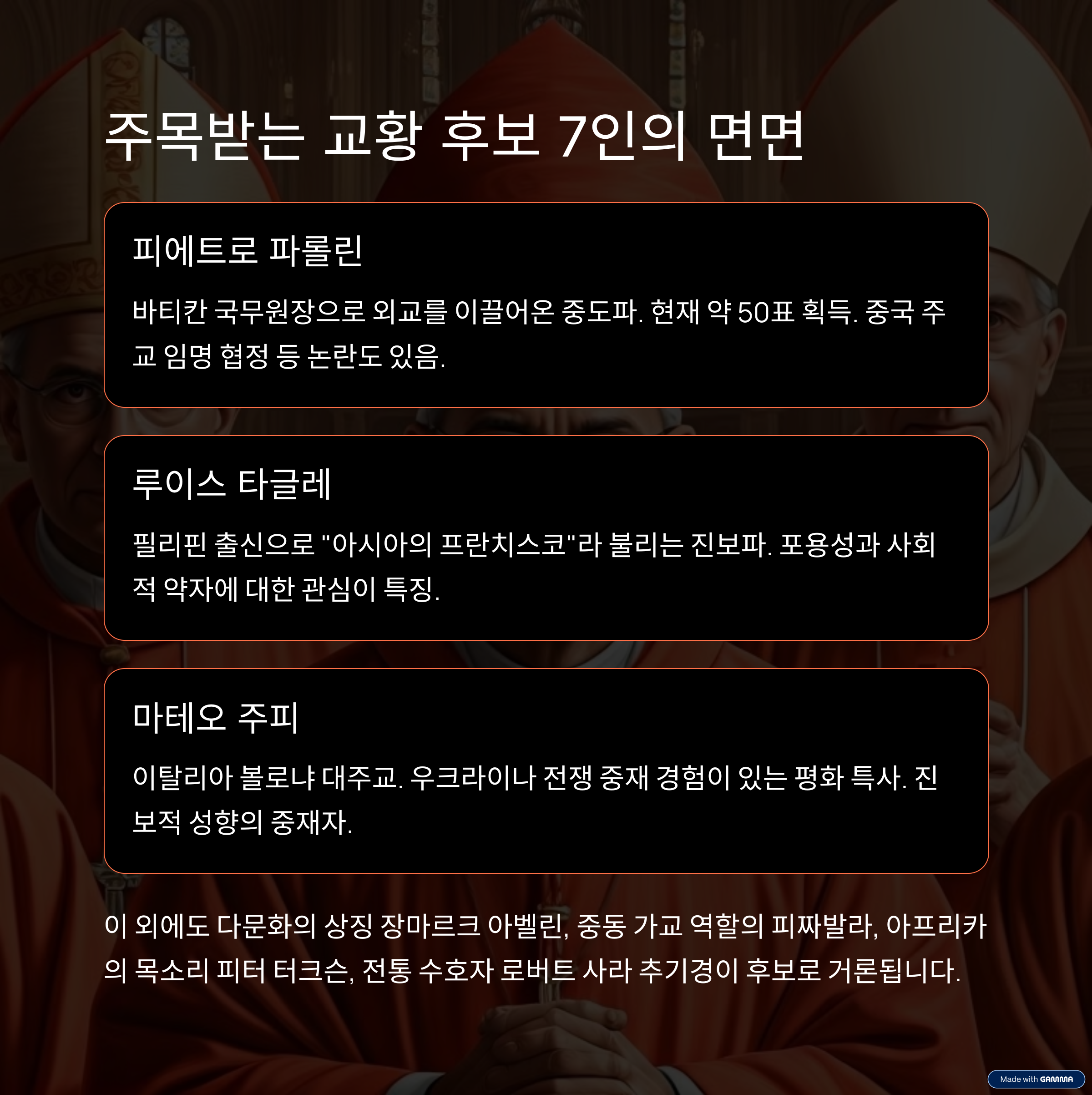 이탈리아 출신의 피에트로 파롤린 추기경은 바티칸 국무원장으로서 오랜 기간 교황청의 외교를 이끌어온 인물입니다. 그는 중도적 성향으로 교황 프란치스코의 개혁을 이어갈 적임자로 평가받고 있습니다. 그러나 일부 추기경들은 그의 카리스마 부족과 과거 중국 주교 임명 협정 등 논란에 대해 우려를 표하고 있습니다.