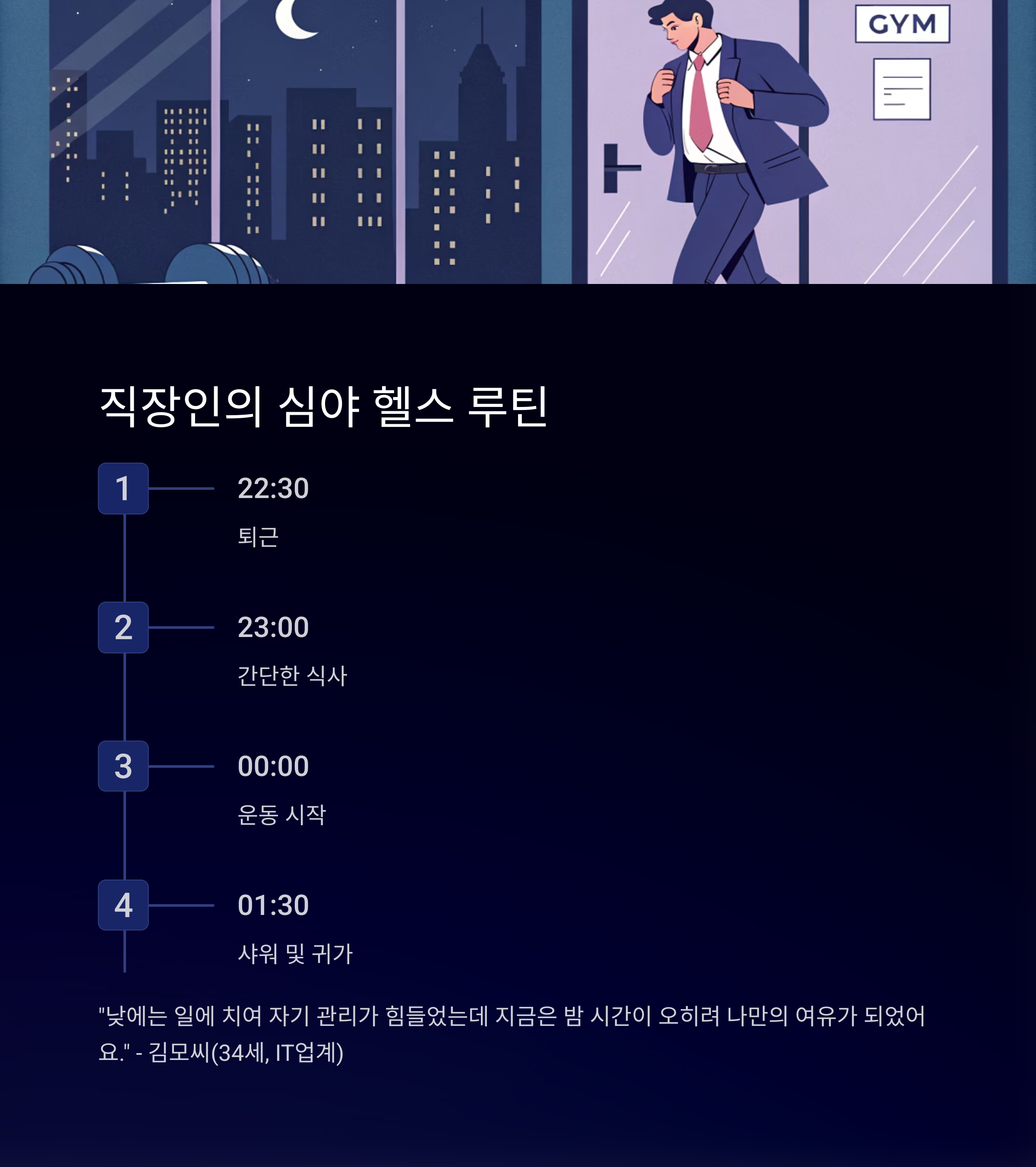 🕐 22:30 퇴근 → 🛍️ 23:00 간단한 식사 → 💪 00:00 운동 시작 → 🛁 01:30 샤워 및 귀가