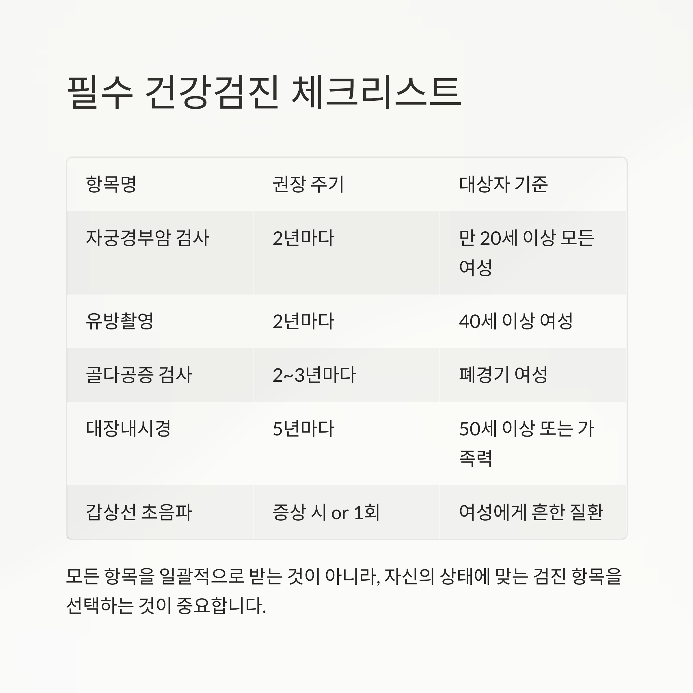 2. 필수 건강검진 항목 체크리스트 (표 정리)