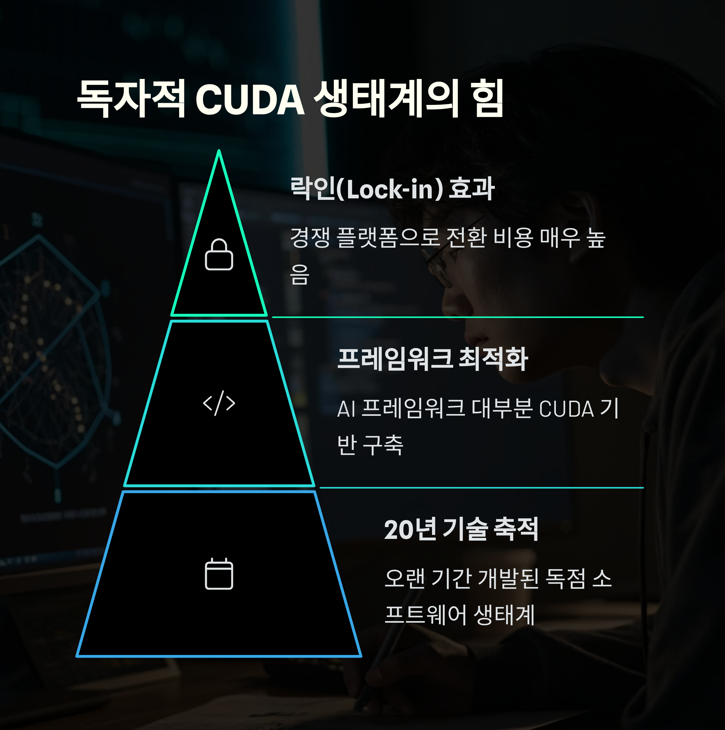 CUDA는 엔비디아가 개발한 GPU 병렬 컴퓨팅 플랫폼이에요. 이 플랫폼 덕분에 개발자들은 GPU를 마치 CPU처럼 쉽게 활용할 수 있게 됐죠. AI 모델 개발자들은 CUDA를 기반으로 딥러닝 라이브러리를 만들 수 있었고, 이게 자연스럽게 엔비디아 GPU 의존도를 높였습니다.