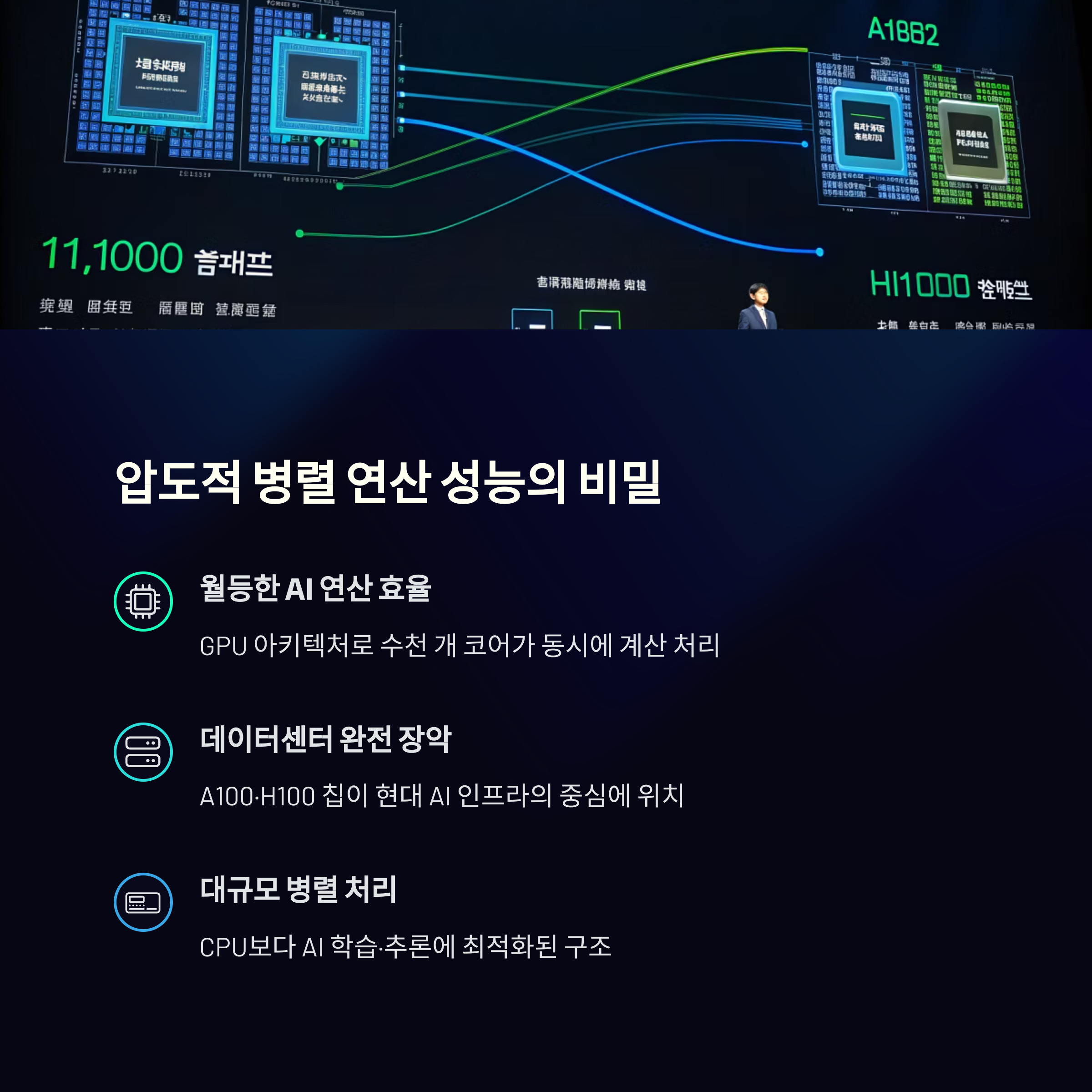 A100은 범용 AI 학습용으로, H100은 초대형 언어 모델이나 고난이도 AI 계산에 더 특화돼 있어요. H100이 최신 버전이라고 보면 됩니다.