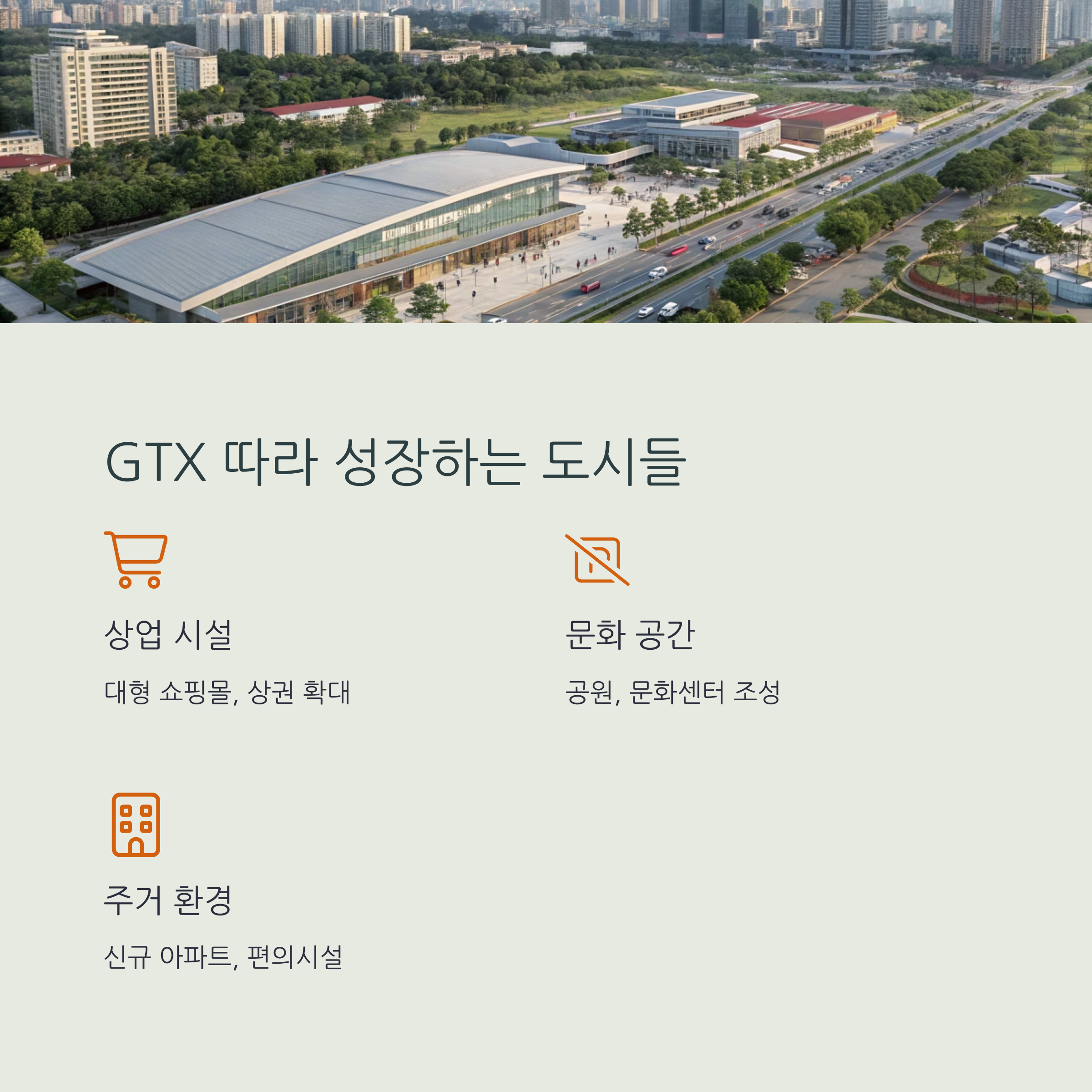 GTX-A, B, C 노선으로 구분되며 각기 다른 지역 연결 | 이동 시간이 절반으로 단축되는 교통 혁신 | 역세권 중심으로 각종 개발 및 투자가 집중 |