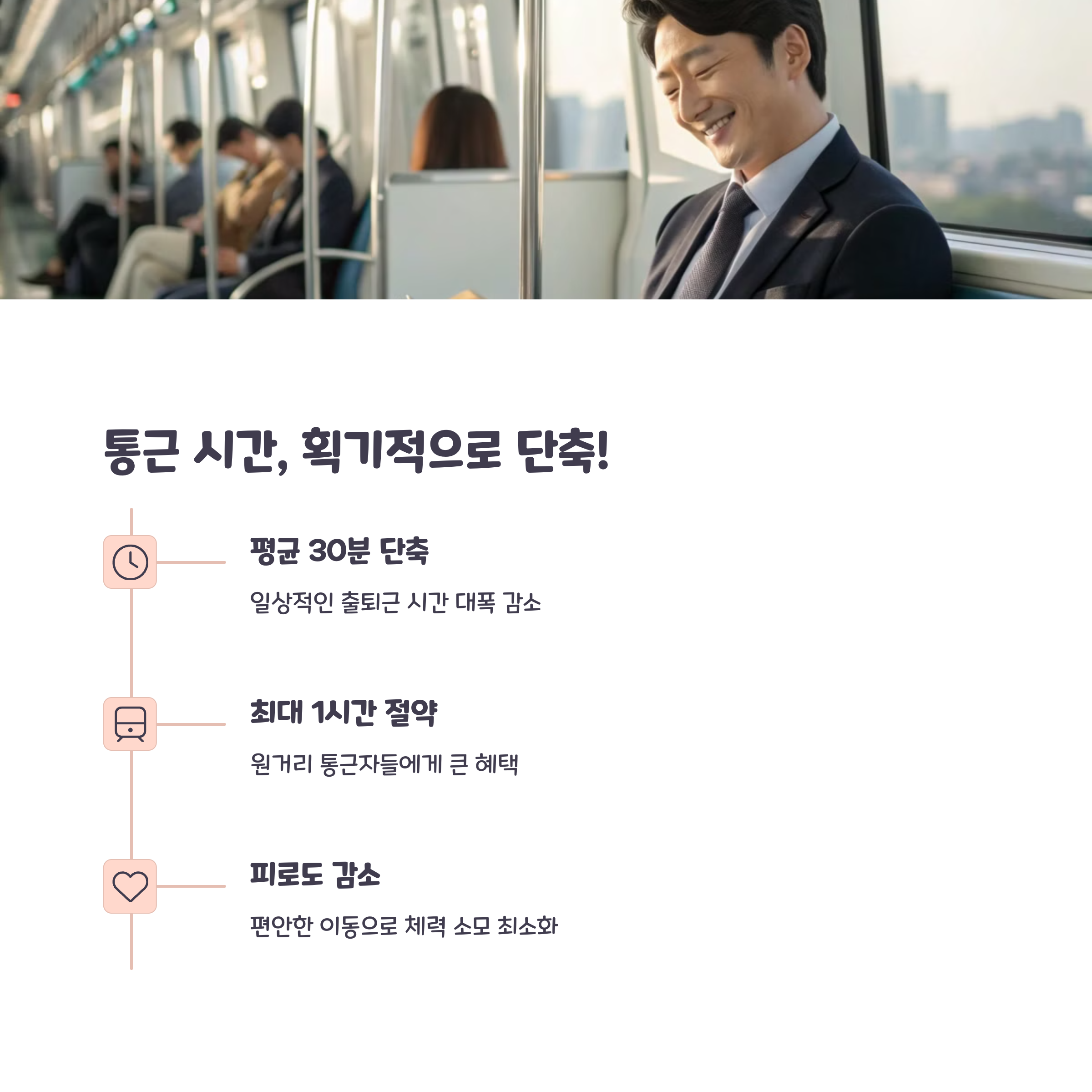 | 통근시간 절감, 스트레스 감소 | 평균 30~60분 단축 예상 | 삶의 질 향상, 여유 시간 확보 |