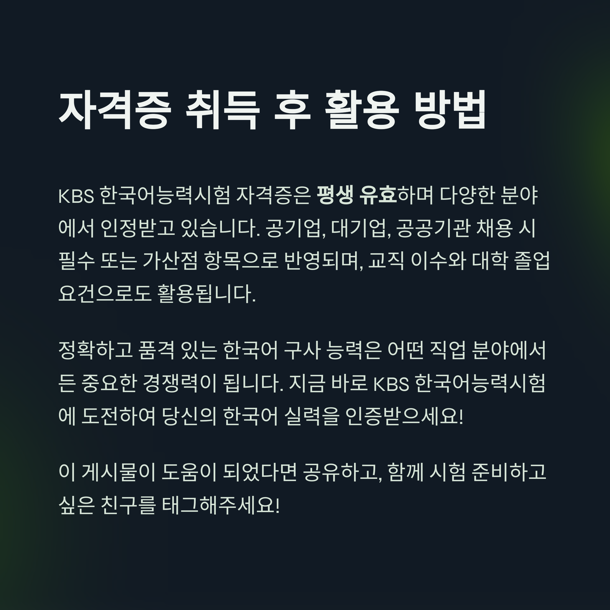 시험 성적은 공공기관 채용 시 가산점, 대학 졸업 요건, 일부 기업 인사 평가에도 반영됩니다.