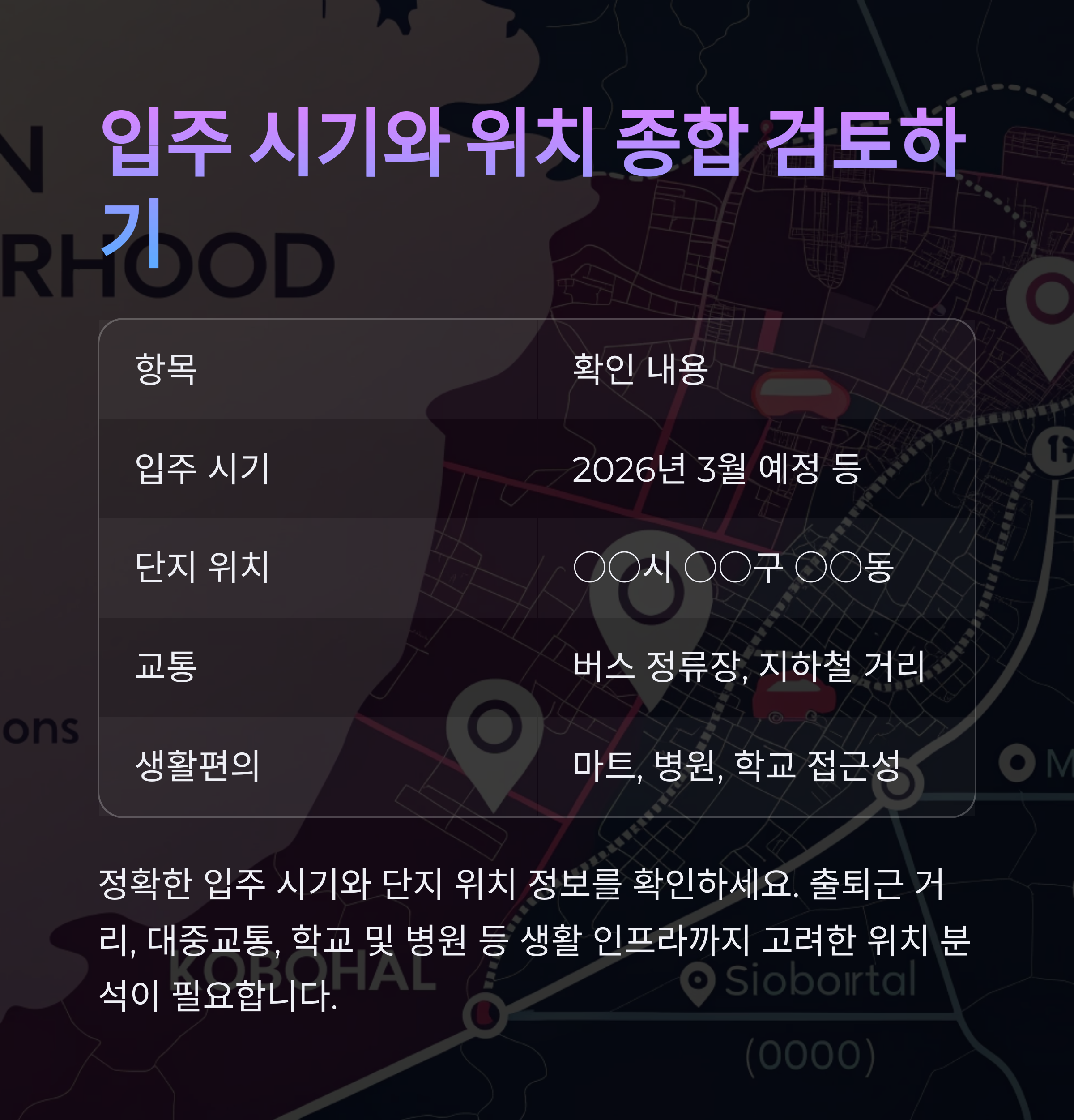출퇴근 거리, 대중교통, 학교 및 병원 등 생활 인프라까지 고려한 위치 분석이 필요합니다.