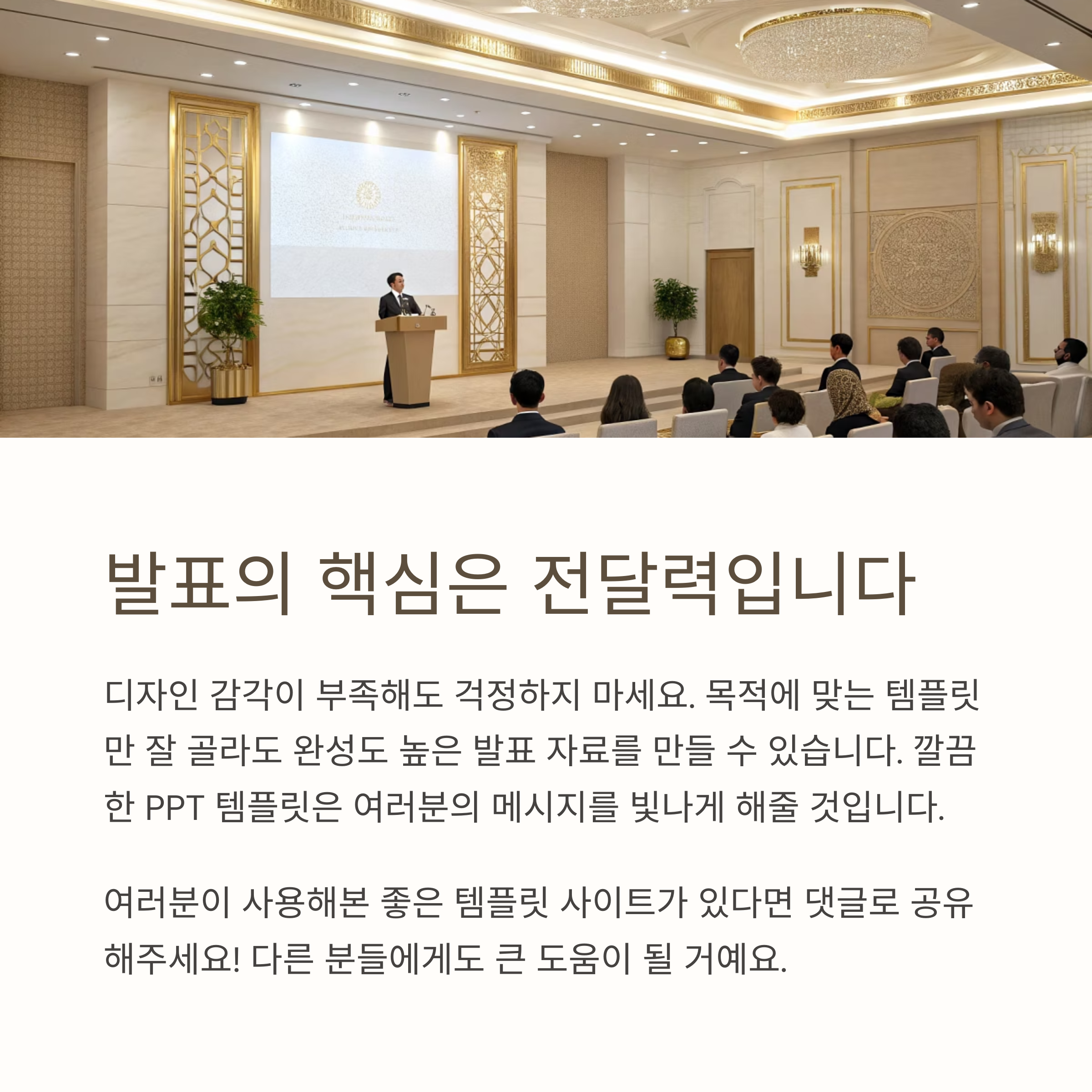 디자인 부담은 줄어들지만, 핵심 내용 구성은 발표자가 직접 해야 한다. 템플릿은 도구일 뿐이다.