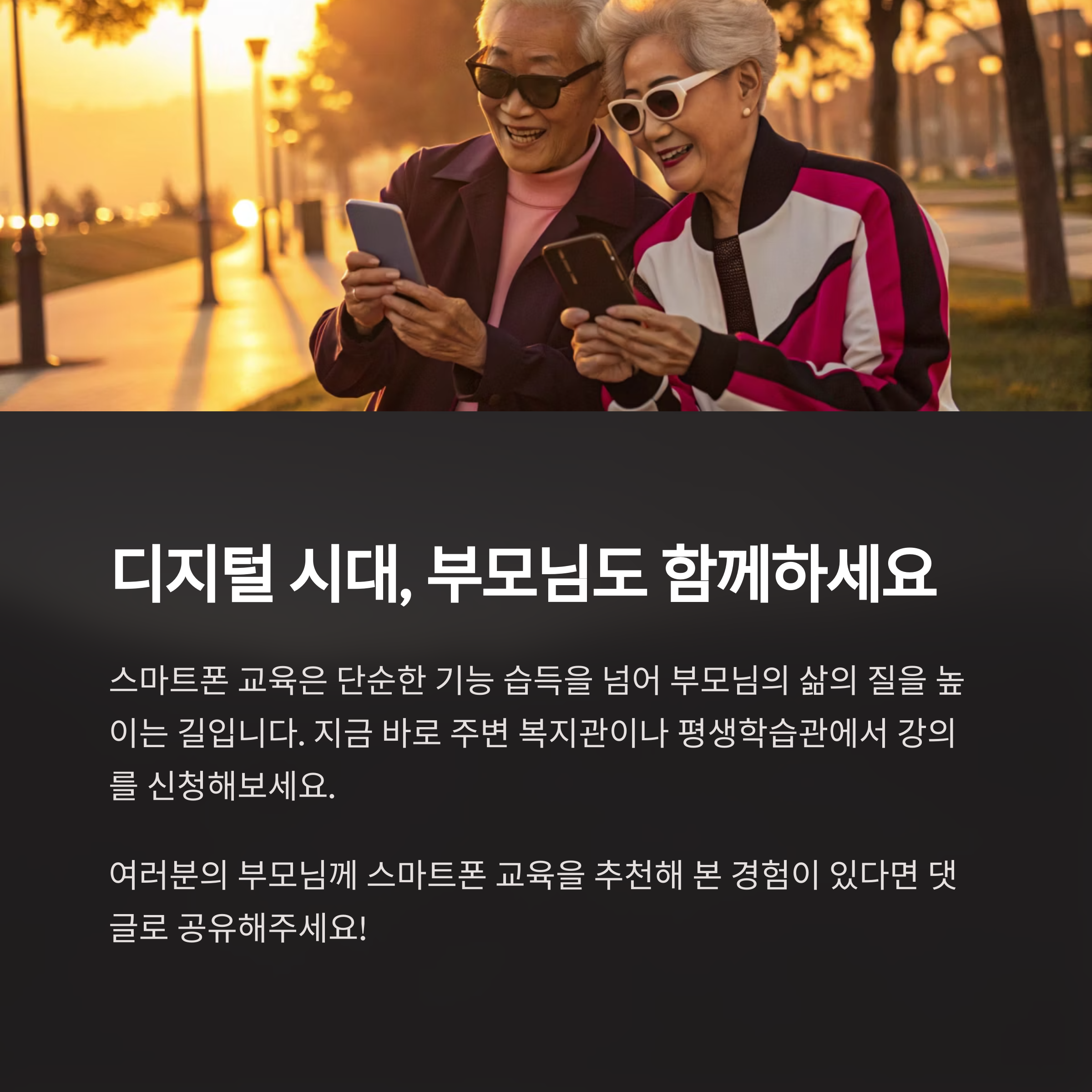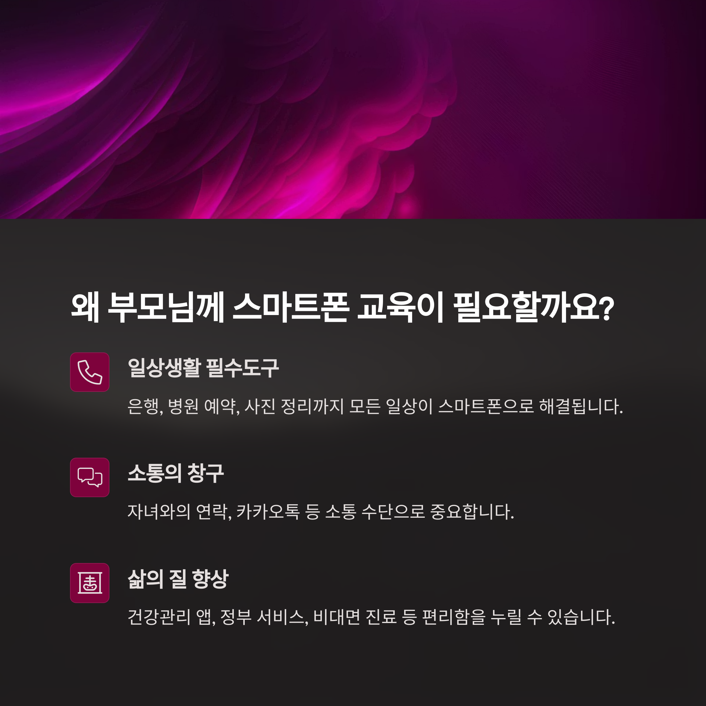 특히 최근 몇 년 사이 온라인 중심의 사회로 급격하게 변화하면서, 스마트폰을 제대로 다루지 못하면 일상생활에서 소외될 수 있다. 이런 변화 속에서 부모님들이 스스로 스마트폰을 익히고, 자신감 있게 사용할 수 있도록 돕는 교육 프로그램들이 점차 늘고 있다.