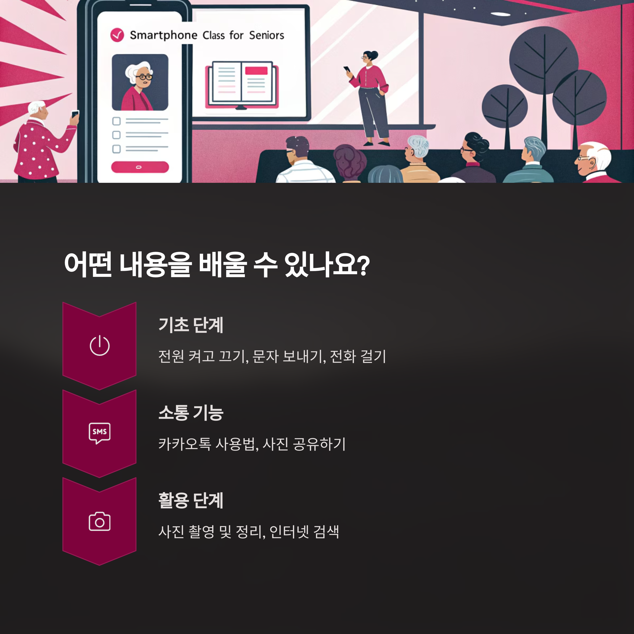 그로 인해 스마트폰 자체에 대한 불신과 거리감이 생기기 쉽고, 결국 최소한의 기능만 사용하거나 아예 사용을 포기하는 경우도 많다. 이는 단순한 기술적 문제가 아니라, 삶의 질과 연결된 문제라고 볼 수 있다. 이런 이유로 체계적인 교육이 중요하다.