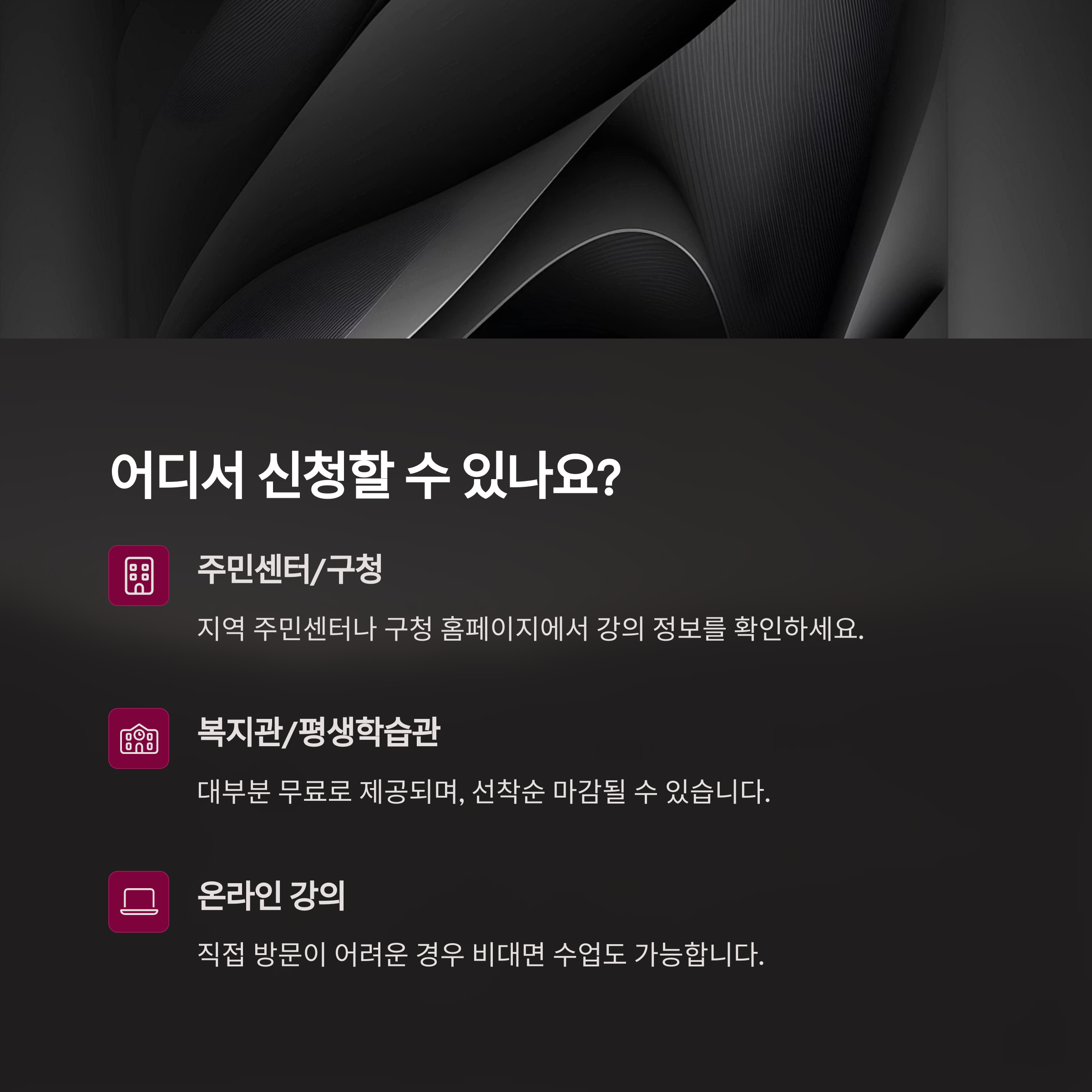 주민센터나 구청 홈페이지에서 해당 강의 신청을 안내하고 있으며, 지역마다 복지관이나 평생교육시설 홈페이지에서도 정보를 확인할 수 있다. 대부분 무료로 제공되며, 일부 강의는 선착순 마감이기 때문에 미리 확인하고 신청하는 것이 좋다.